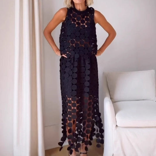 Casie See Through Circle Embroidery Elastic Waist Tassle Hem Maxi Skirt